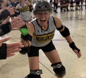 Shot of me and my teammates during warmups at my first ever bout. Note the decidedly uncomfortable squat position every single one of us is in. Morgantown Roller Vixens vs Steel City Beamers, Sept 2018 (Photo credit: Don Chiurazzi)
