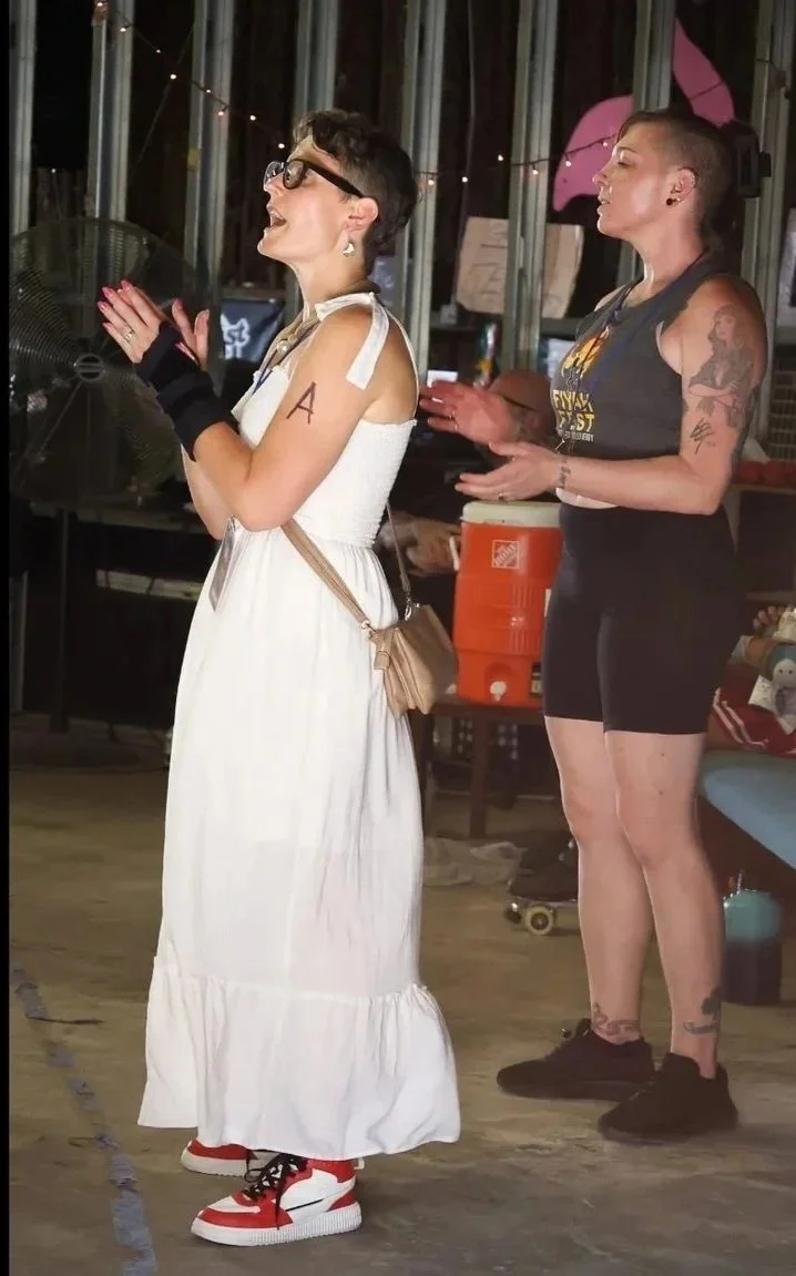 That’s why I start teaching this skill to our junior derby kids first, before getting low, before falling small, before we even put on skates! I start this lesson during introductions by loudly and proudly projecting my derby name, pronouns, and how long I have been skating over top of the many large whooshing fans inadequately cooling our hot warehouse. In so doing, I model the behavior I encourage and expect, granting them permission to be as loud too.