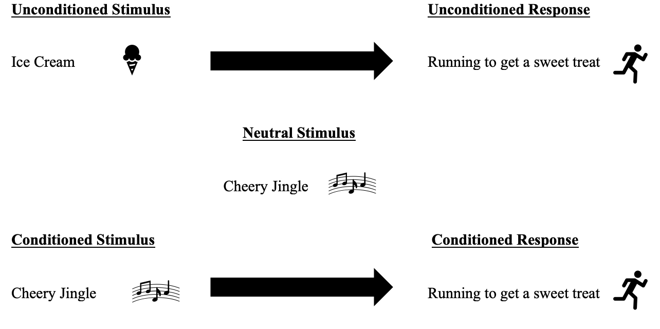 For example, kids won’t do much in response to the sound of an old out-of-tune jingle (neutral stimulus) yet they don’t have to be trained to come running (unconditioned response) if you yell ‘ice cream’ (unconditioned stimulus)*. But just like Pavlov demonstrated in his experiments with dogs and kibble and bells, it doesn’t take children many hot summer afternoons to associate neutral signals of a slow moving truck rolling down the street playing a cheery tune (now considered the conditioned stimulus as pairings take place across time) with an understanding and excitement that they are about to get a sweet treat, which now triggers a ‘bolting outside’ (conditioned) response.
